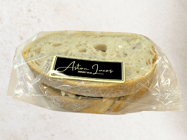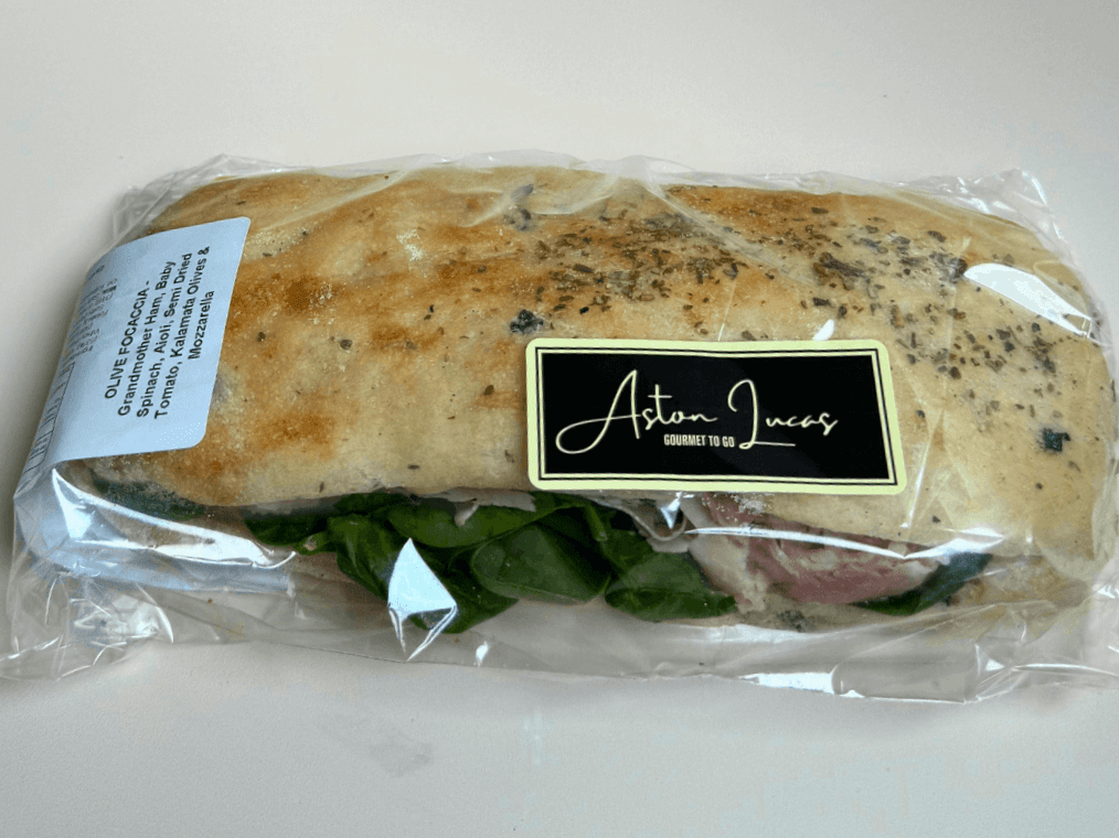 Award-winning Grandmother ham with punchy semi-dried tomatoes, kalamata olives, mozzarella, baby spinach and aioli on decadent olive focaccia is a combo sure to make the taste buds dance.