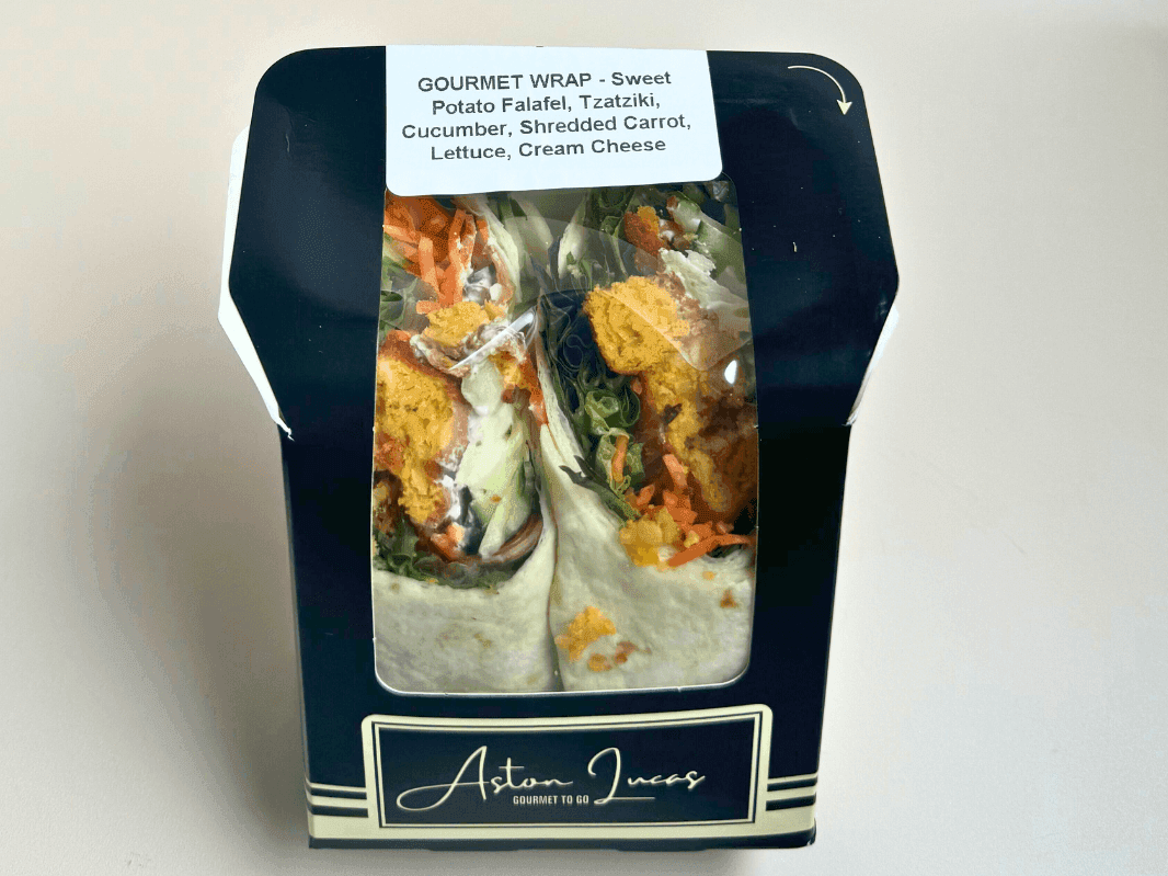 Middle-eastern flavours unite to make a vegetarian delight in this vibrant combination of sweet potato falafel, tzatziki, cucumber, shredded carrot, lettuce and cream cheese.