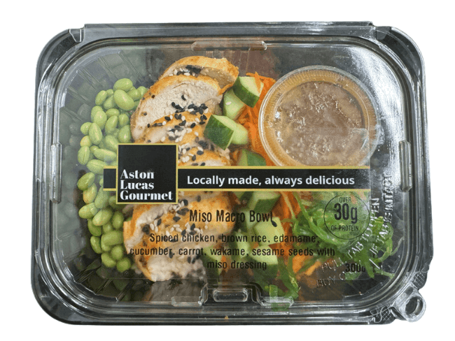 Packed with over 30g protein, our miso macro bowl will keep your fitness goals in check without sacrificing flavour. Spiced chicken, brown rice, edamame, cucumber, carrot, wakame and sesame seeds come together with a miso dressing for a healthy, flavour-packed meal on the go.
