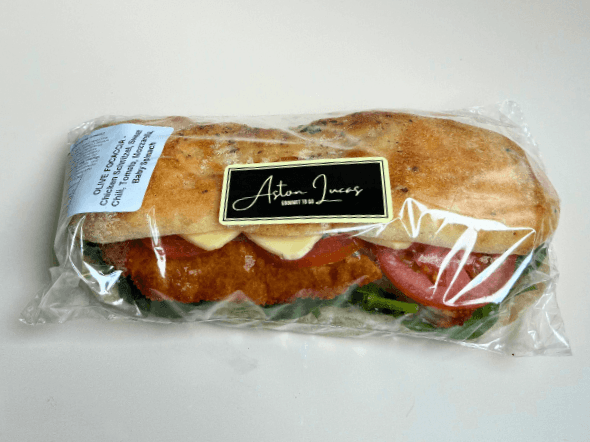 This gourmet olive focaccia speaks for itself with its flavourful combination of tender chicken schnitzel, fresh tomato, mozzarella, baby spinach and a sweet chilli sauce.