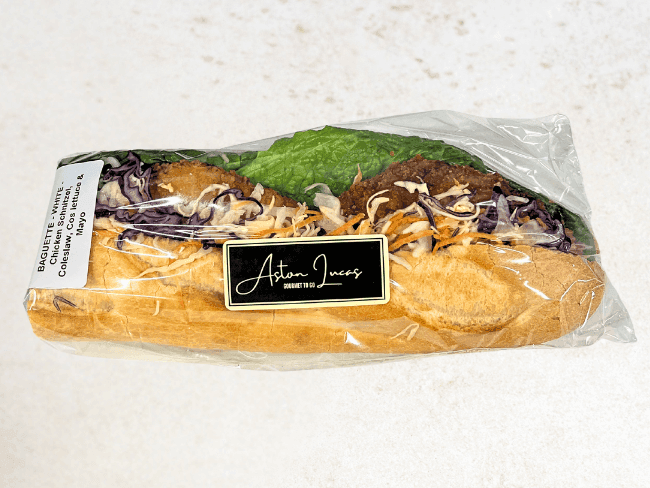 Fresh white baguette roll filled with tender chicken schnitzel, coleslaw, crispy cos lettuce and creamy mayo for a deliciously juicy flavour combo.