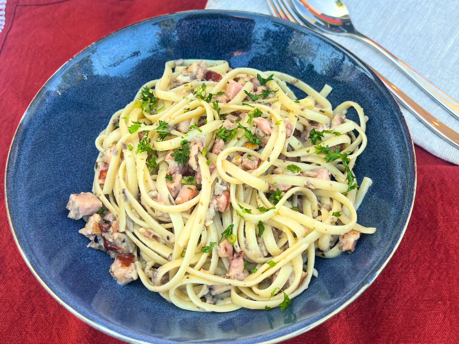 This rich and creamy linguine is tossed with succulent mushrooms, juicy bacon and an aromatic mix of garlic, rosemary and oregano to produce an indulgent creamy pasta- without the cream. Would you believe us if we told you this decadent dish is dairy free? Think creamy indulgence without the stomach ache
