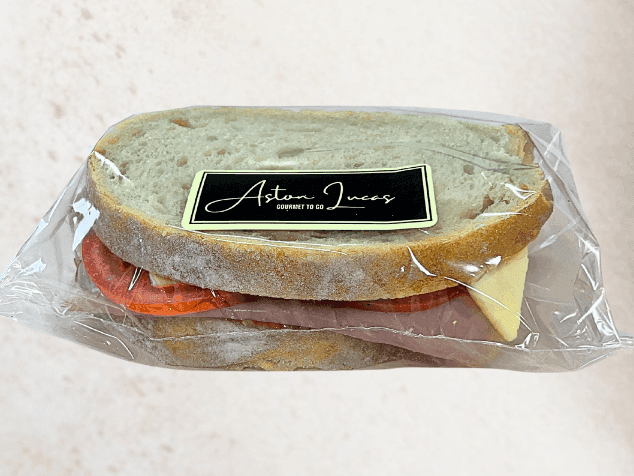 A delectable bundle of champagne ham, fresh tomato, sweet mustard pickle, cheese, lettuce and cream cheese.