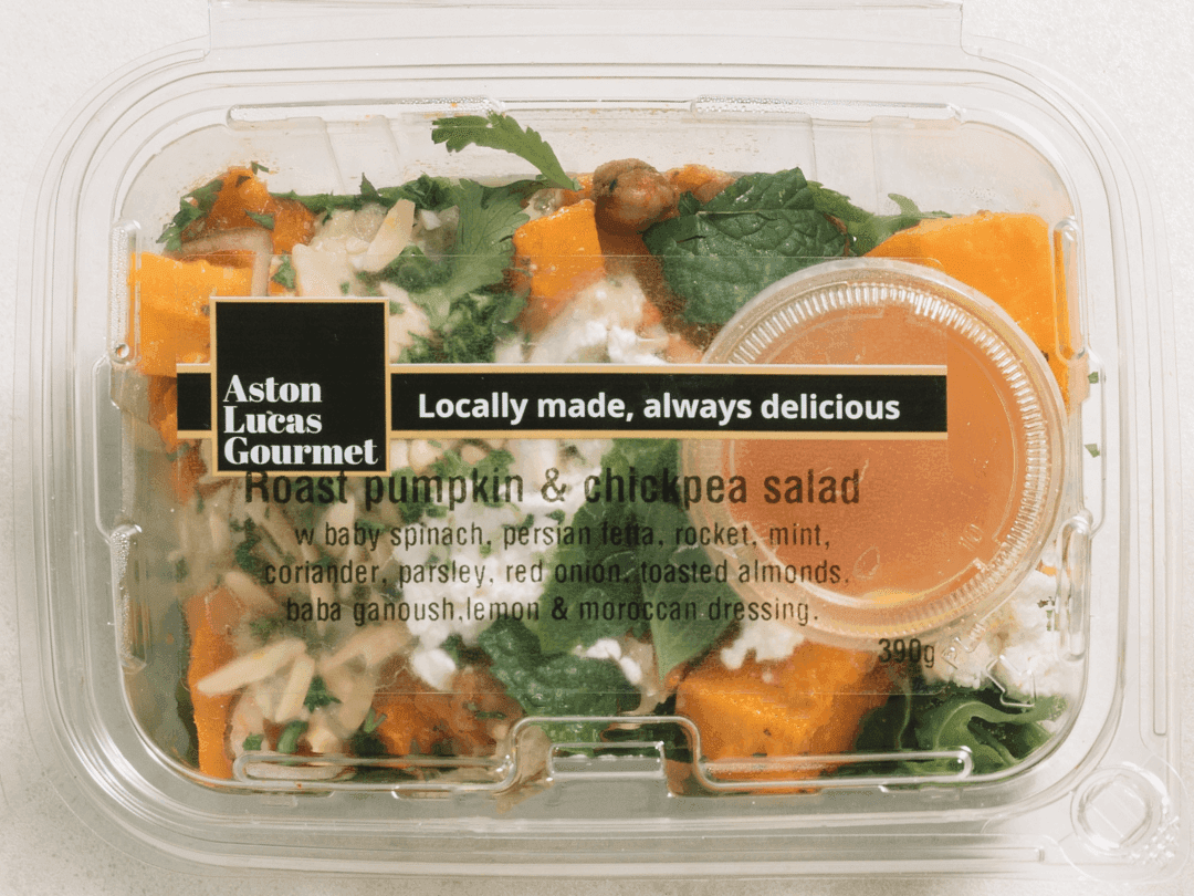 This healthy gluten-friendly salad knows what it’s doing. An unapologetic mix of roasted pumpkin, chickpeas, baby spinach, Persian feta, rocket, mint, coriander, parsley, red onion, toasted almonds, baba ganoush and a lemon & Moroccan dressing.