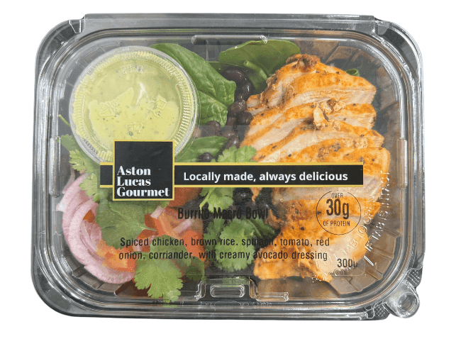 A Mexican-style delight, this macro-friendly combo of spiced chicken, brown rice, spinach, black beans, tomato, red onion, coriander and a creamy avocado dressing ignites a fiesta in the mouth!
