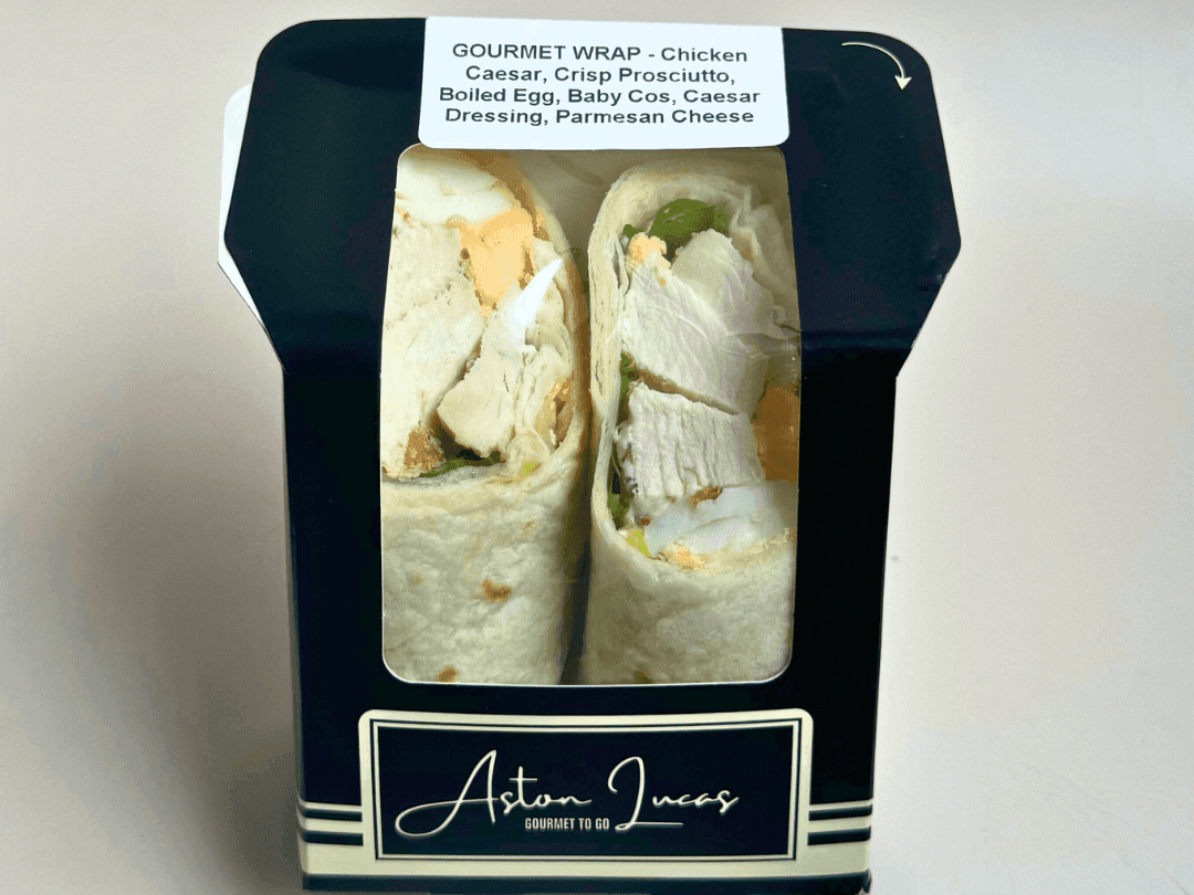 For when you’re craving the taste of a classic caesar salad, but you can’t sit down to eat it… tender chicken, crisp prosciutto, boiled egg, baby cos lettuce, caesar dressing and a sprinkle of parmesan cheese all wrapped up for your convenience.