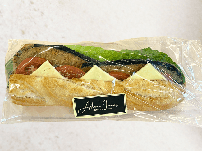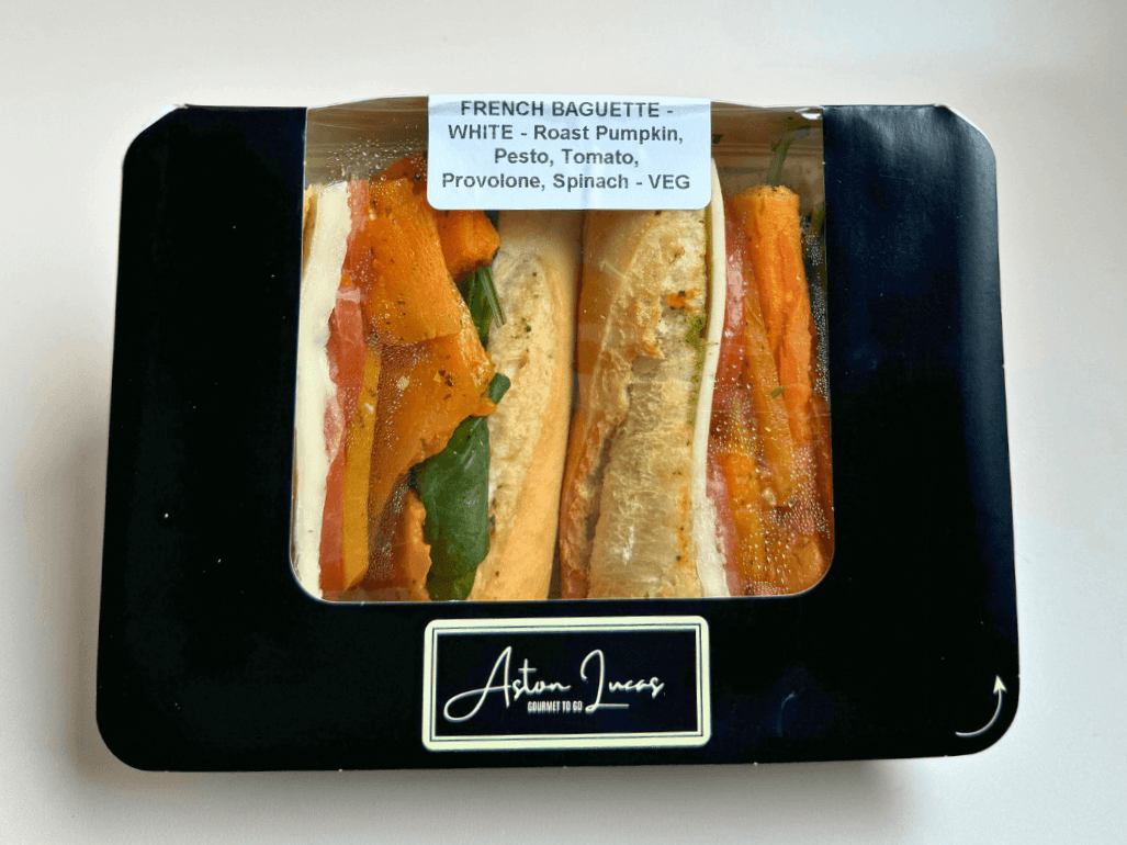 This generously portioned white baguette roll offers a filling yet fresh meal on the go. Combining lightly crumbed eggplant with mozzarella, pesto and fresh cos lettuce and tomato, this baguette is a vegetarian dream.
