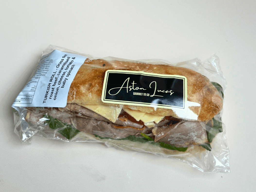 Grass Fed Roast Beef, Caramelised Onion, Feta, Tomato, Rocket, Cream Cheese