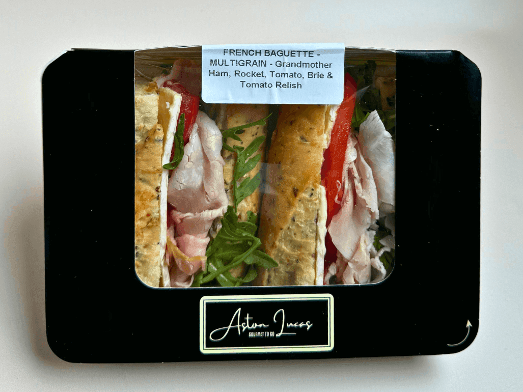 Like a charcuterie board on a sunny afternoon, but in sandwich form. Fresh french baguette with grandmother ham, rocket, tomato, brie and tomato relish.