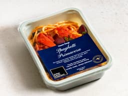 Spaghetti cooked [Water, Spaghetti (Wheat), Canola oil, Salt], Primavera Sauce [Capsicum, Mushrooms, Red onion, Tomato puree, Canola oil, White wine, Garlic, Canola (Soy), Water, Onion, Carrots, Celery, Table salt, Sugar, Basil, Garlic raw, Bay leaves], Napoli Sauce [Tomato puree, Canola oil, Water, Onion, Carrots, Celery, Table salt, Sugar, Basil, Garlic, Bay leaves], Olives, Parsley