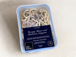 Linguine with creamy bacon and mushroom sauce [Water, Pasta linguine (Wheat), Mushrooms, Bacon, Canola (Soy), Dairy-free cream (Soy), Garlic, Onion, Canola oil, Salt, White wine, Table salt, Rosemary, Oregano], Oven roasted sliced mushrooms [Mushrooms, Canola oil, Table salt, Parsley], Bacon