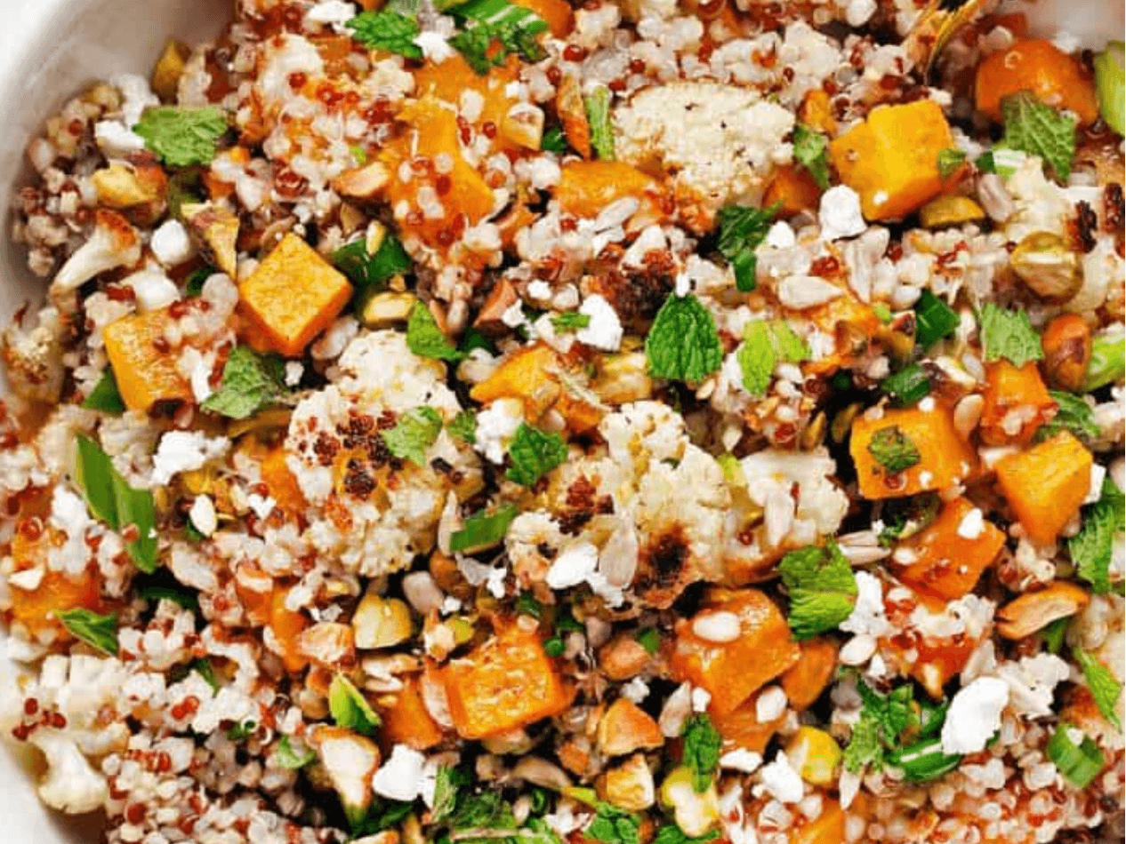 Have it warmed or eat it cold, this salad is sure to please. Roasted cauliflower and pumpkin with red onion, quinoa, smokey roasted chickpeas, fresh herbs and lemony Chimichurri dressing.