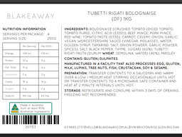 Bolognese [Beef mince, Pork mince, Tomato paste, Carrots, Celery, Onion, Garlic, Salt, Sugar, Thyme, Black pepper, Vegan worcestershire sauce, Crushed tomato (diced tomato, tomato puree, citric acid (e330), Red wine], Tubetti rigati pasta (Wheat), Parsley