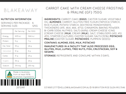 Luscious, spiced, and impossibly good – this gluten-free carrot cake is made with almond meal, fresh carrots, and a hint of orange zest for brightness. Finished with a silky cream cheese icing and a dusting of praline, it's a classic done the BLAKEAWAY way. Quality, Care, Convenience.