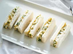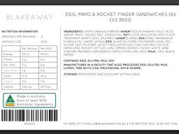 White sandwich bread [Water, Enzymes (wheat), Wheat flour (thiamin, folic acid), yeast (Wheat), Iodised salt, Soy flour, Emulsifier (471), Flour treatment agent (300), Canola oil], Salt, Black pepper, Egg, Horseradish (Milk, Soy, Sulphites), Mayonnaise (Egg), White wine vinegar, Rocket lettuce, Spring onion, Chives