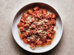 Bolognese [Beef mince, Pork mince, Tomato paste, Carrots, Celery, Onion, Garlic, Salt, Sugar, Thyme, Black pepper, Vegan worcestershire sauce, Crushed tomato (diced tomato, tomato puree, citric acid (e330), Red wine], Tubetti rigati pasta (Wheat), Parsley
