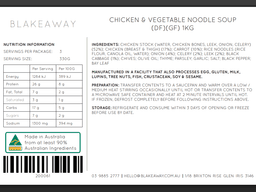 Chicken breast & thigh, Carrots, Rice noodle, Onion, Celery, Leek, Black cabbage, Chives, Thyme, Parsley, Garlic, Salt, Pepper, Bay leaves, Chicken Stock [Water, Chicken bones, Leek, Onion, Celery], Olive oil