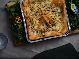 Ricotta (Milk), Spinach, Silverbeeet, Danish feta (Milk), Onion, Spring onion, Pine nuts, Pure cream (Milk), Dill, Olive oil, Garlic, Sesame seed, Pastry (Wheat, Milk, Soy)