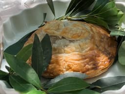 "A pithivier is a round, enclosed pie usually made by baking two disks of puff pastry, with a filling stuffed in between. It has the appearance of a hump and is traditionally decorated with spiral lines drawn from the top outwards with the point of a knife, and scalloping on the edge." Our version is a beauty stuffed with salmon, leek and cream cheese with herbs. Simply re-heat in the oven at 160 for 10-15 minutes.