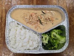 Prawns (Crustacean), Rice, Broccoli, Coconut Milk [Coconut cream, Water, Thickener (415)], Crunchy Peanut Butter [Roasted Peanuts (85% Minimum), Sugar, Vegetable oil, Salt, Stabiliser], Zucchini, Red onion, Vegetable oil, Fish Sauce [Anchovy (Fish), Salt, Sugar], Tinned Pineapple [Pineapple, Pineapple juice], Sea salt, Red Curry Paste [Garlic, Dried Red Chilli, Lemongrass, Shallots, Salt, Galangal, Shrimp Paste (Crustacean), Kaffir lime peel, Pepper], Potato starch, Sugar