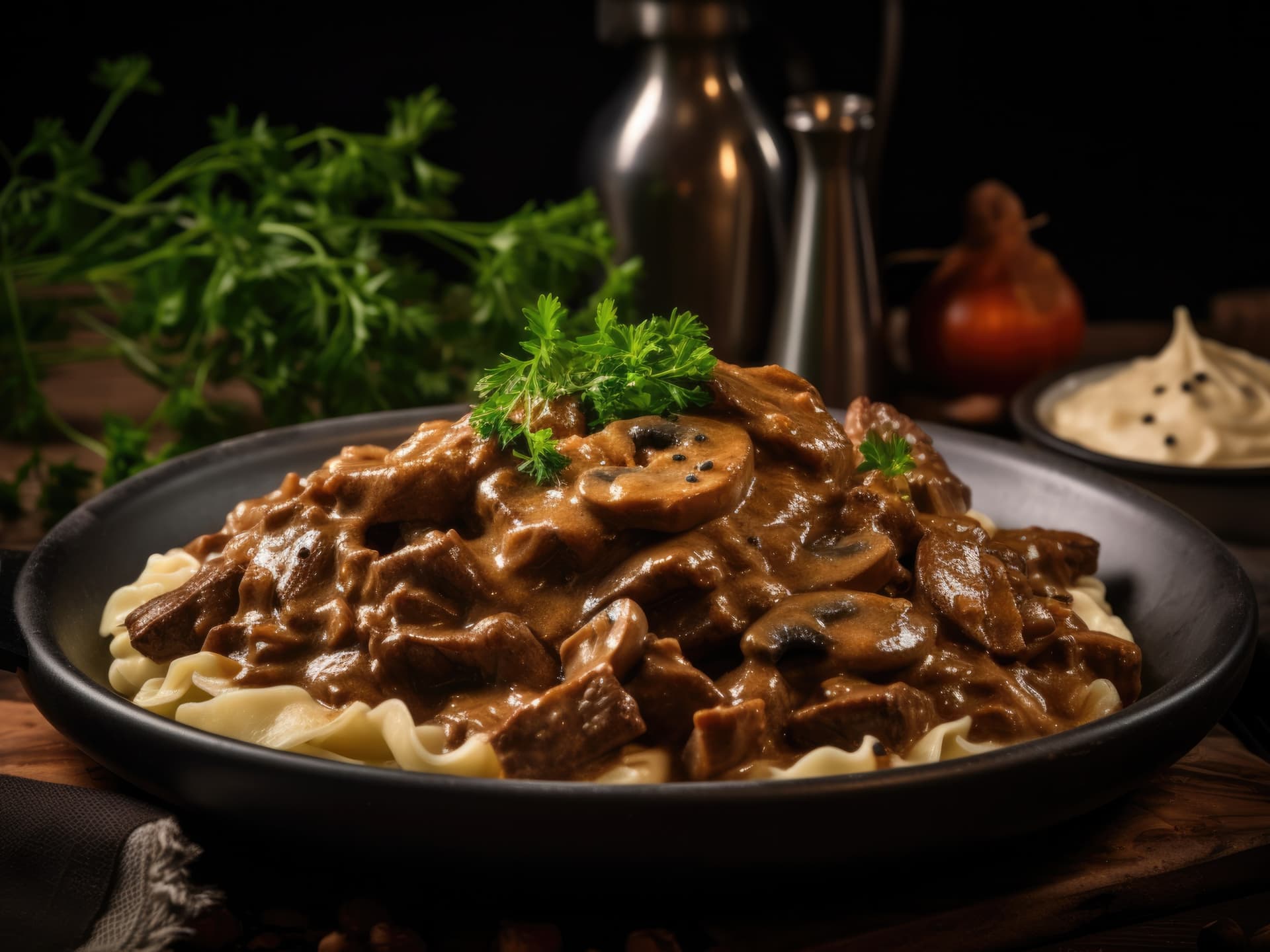 Slow cooked beef stroganoff served with pasta, beans and peas