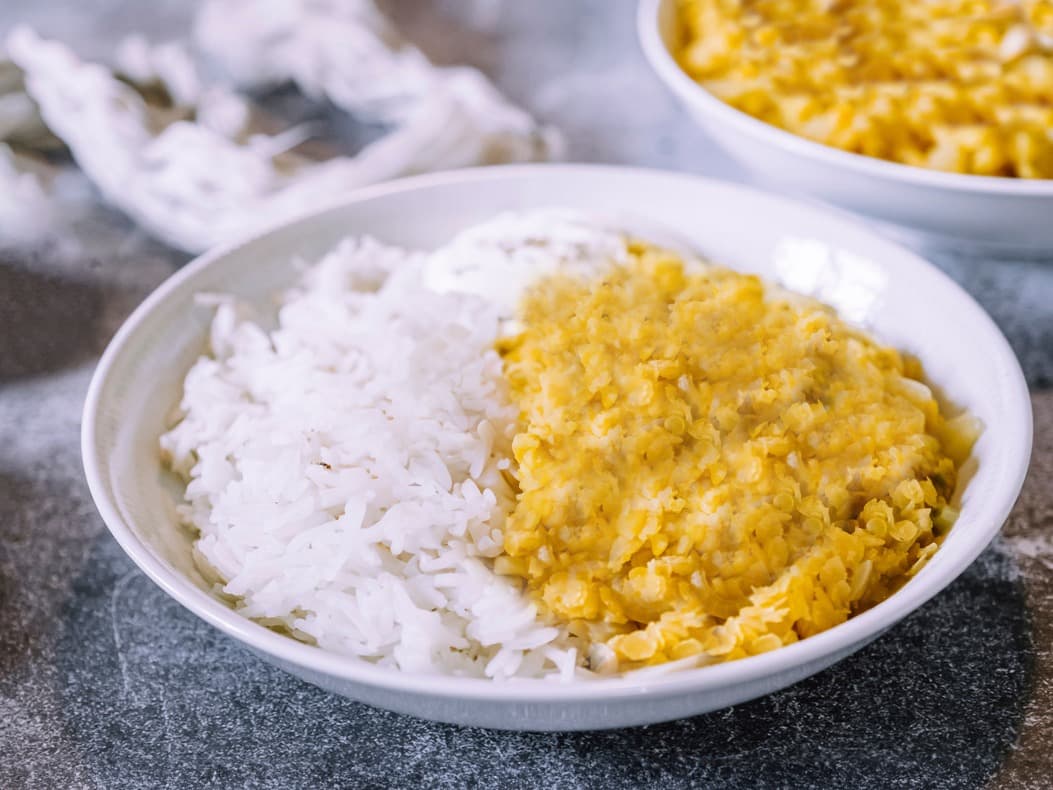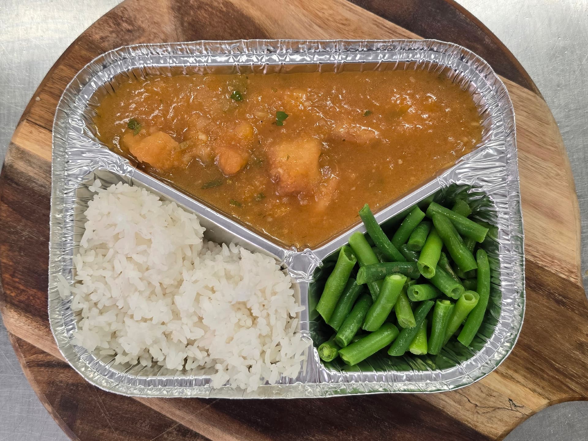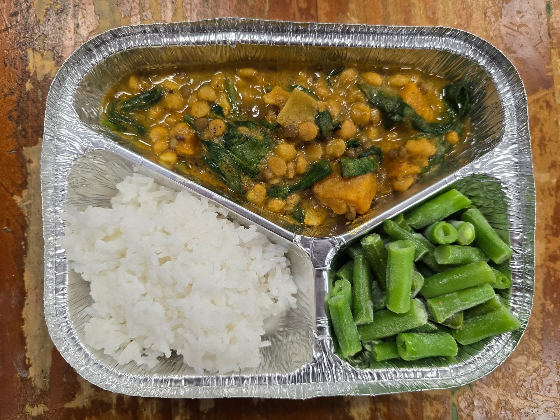 Lentil, pumpkin and spinach curry (Dahl) served with rice and green beans