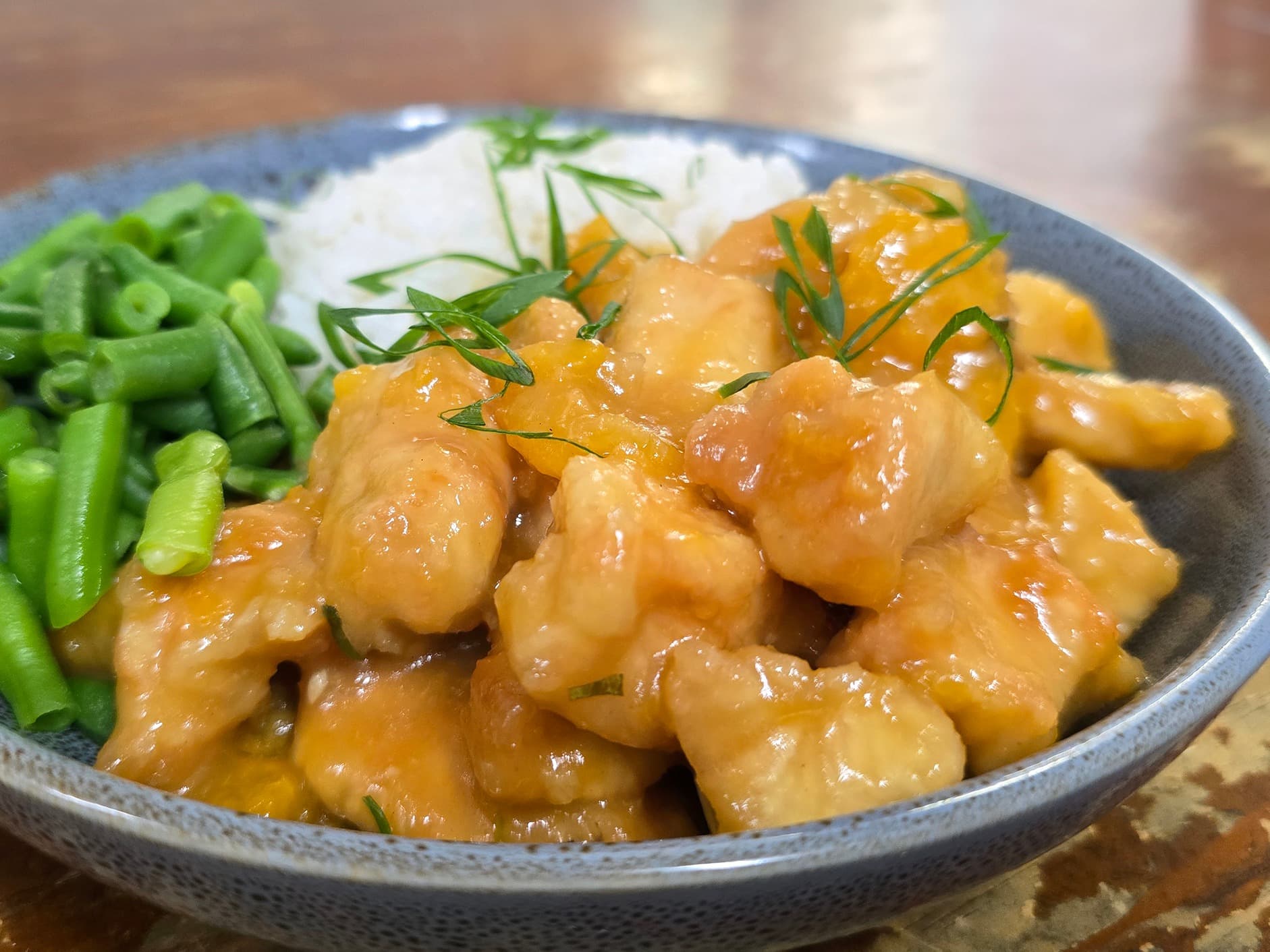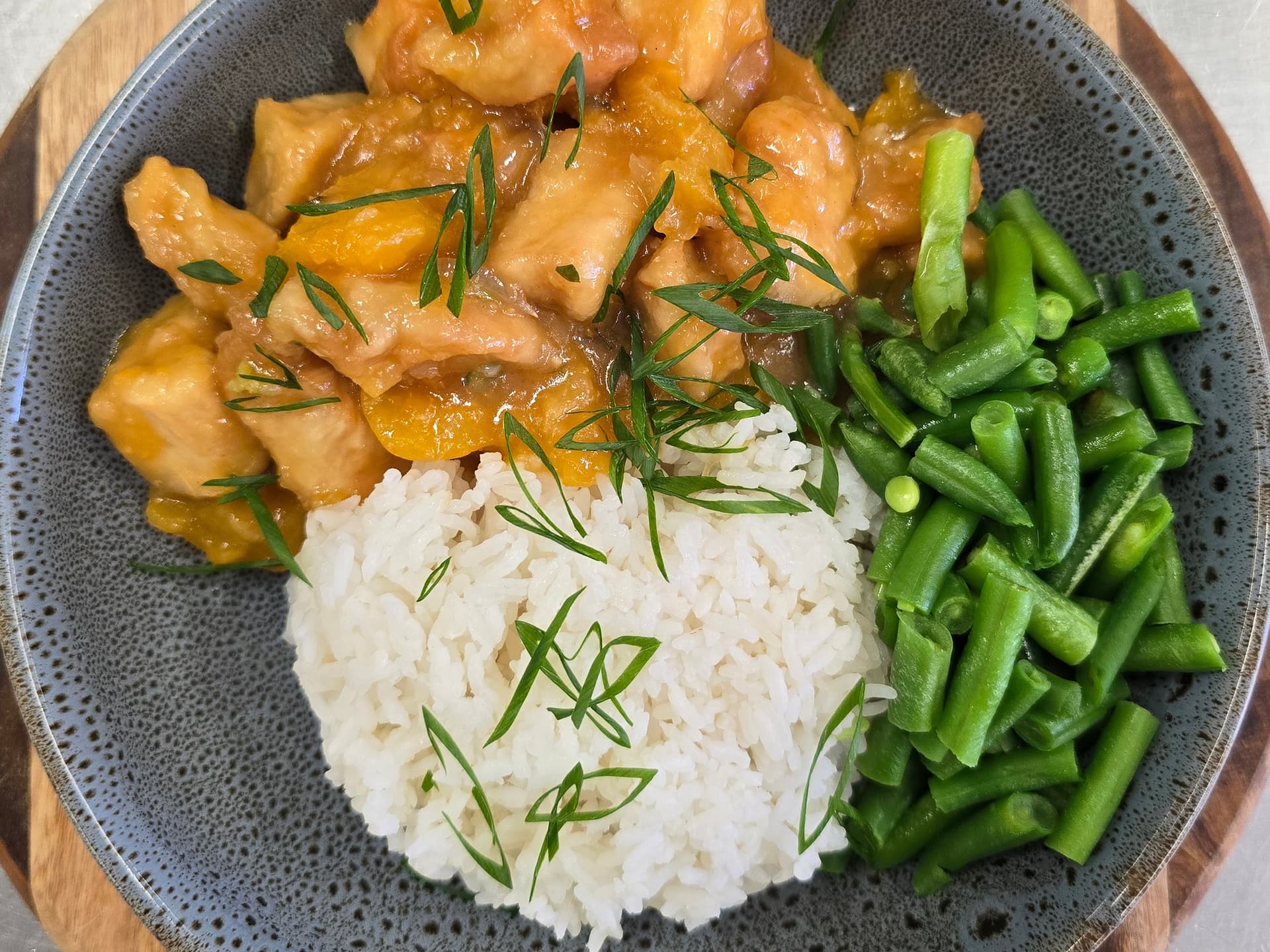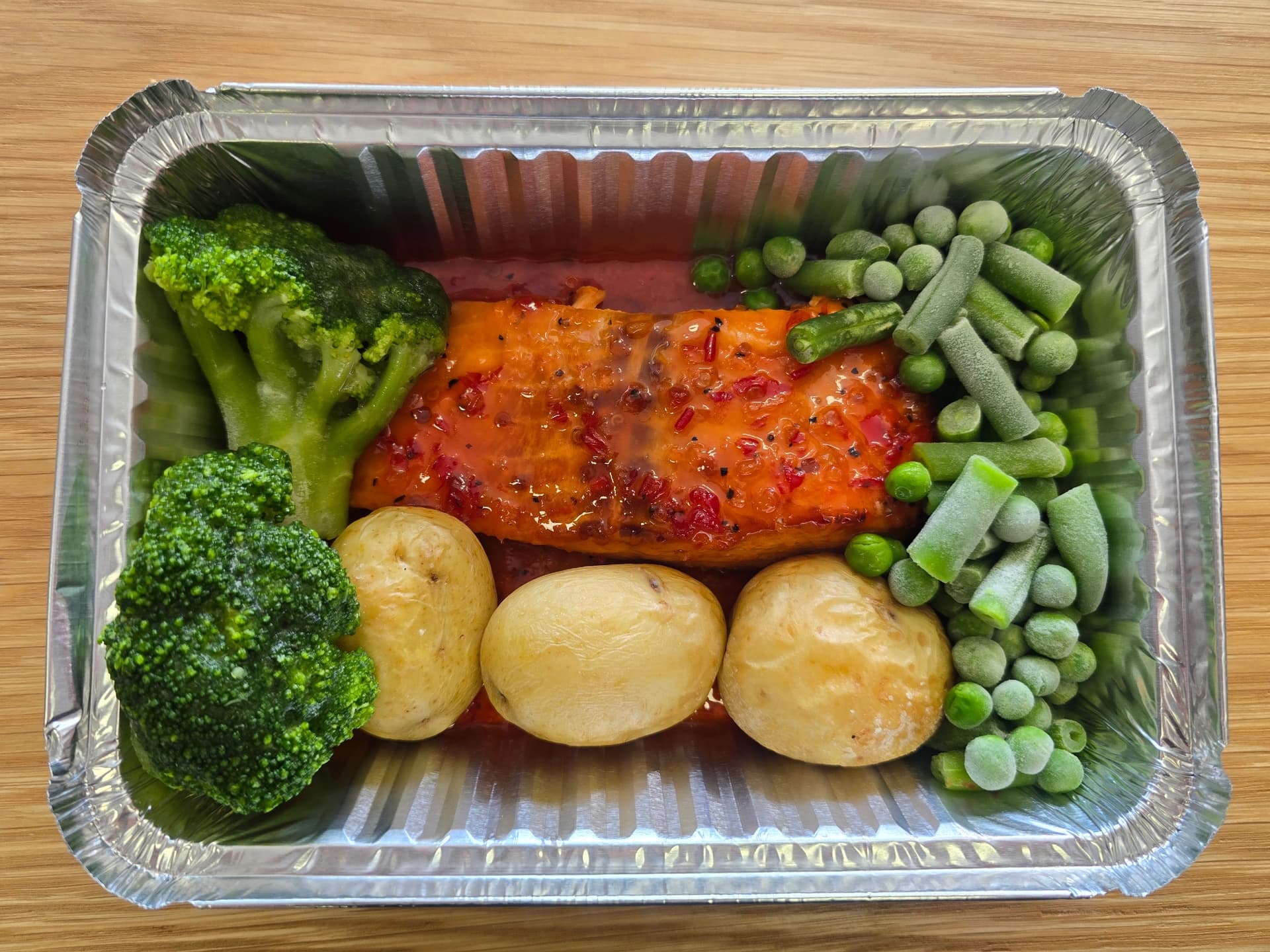 Sweet chilli baked salmon served with roasted chat potatoes, broccoli, green beans and peas.