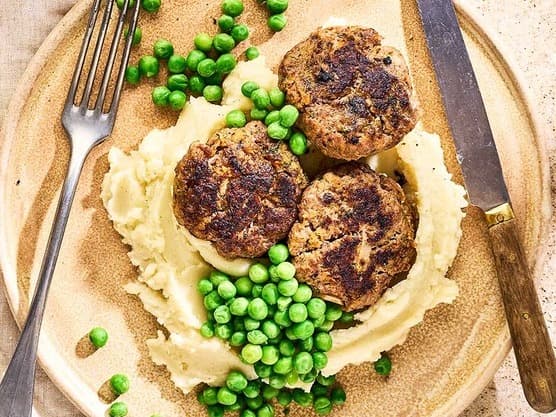 Rissoles in onion gravy served with mash potatoes, peas & carrots