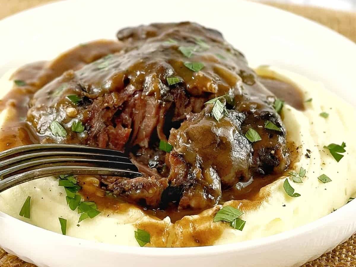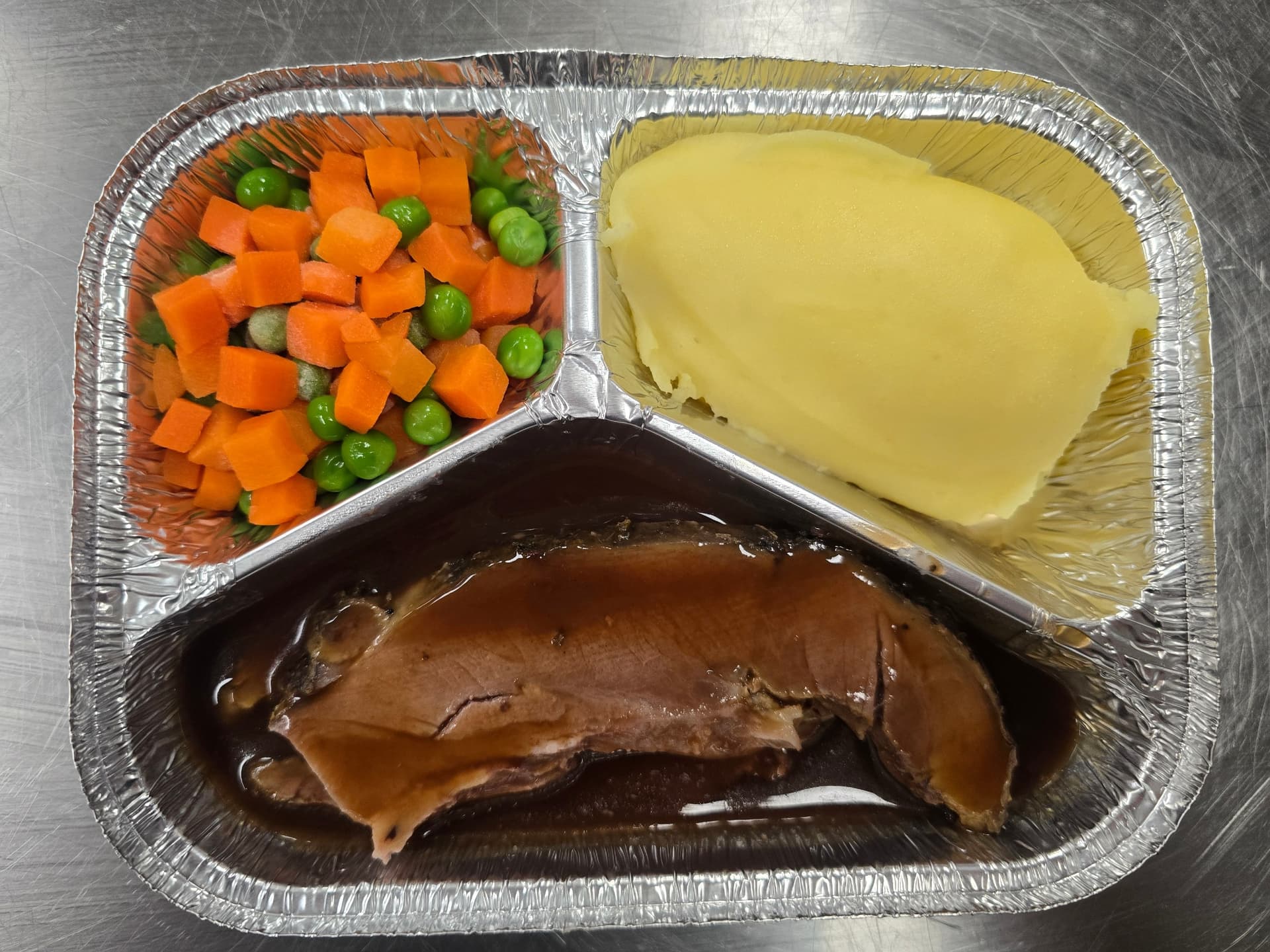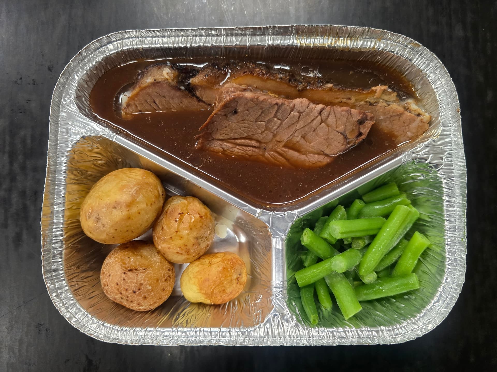 Slow-cooked beef in gravy served with roasted chat potatoes & green beans.