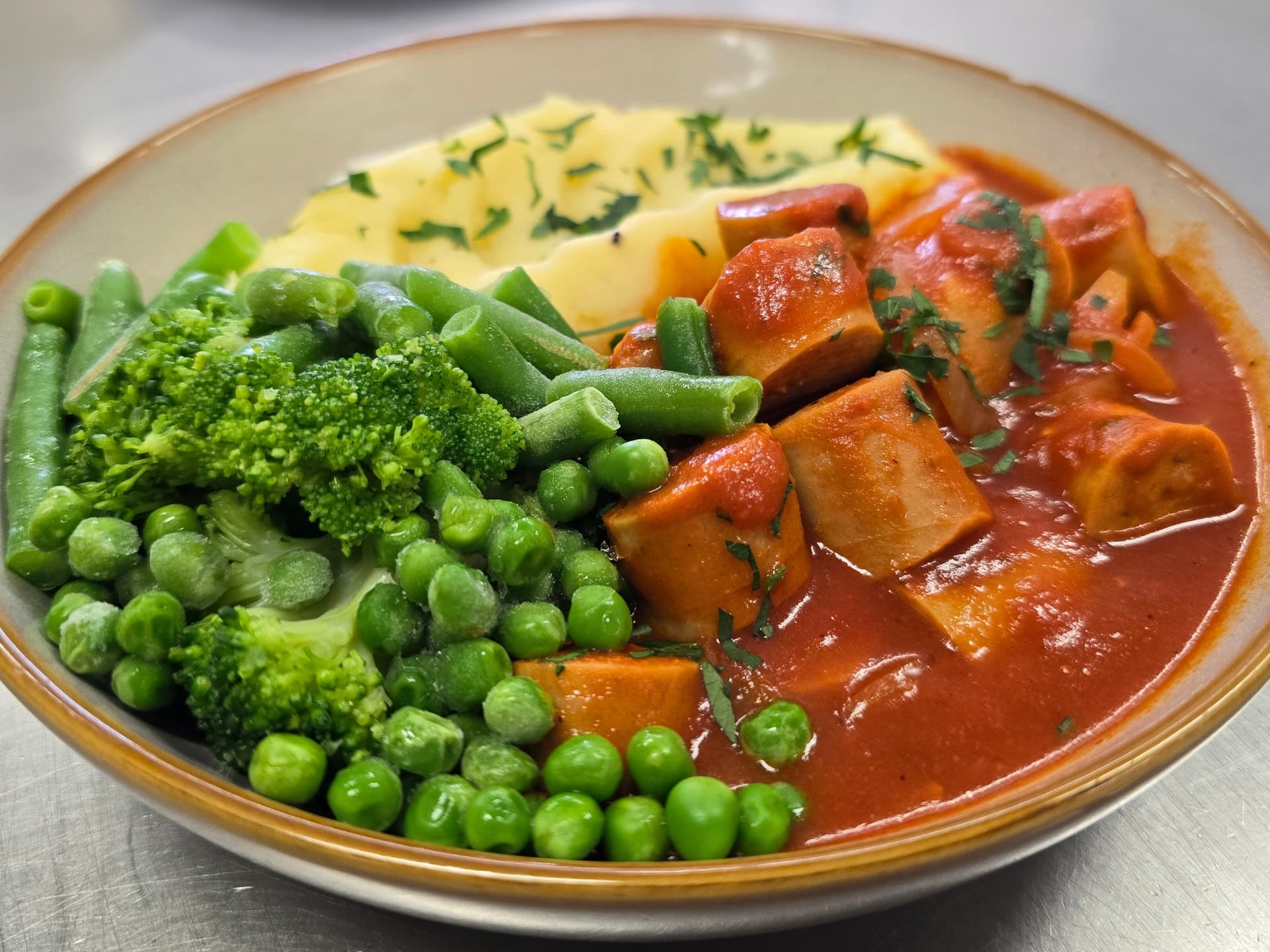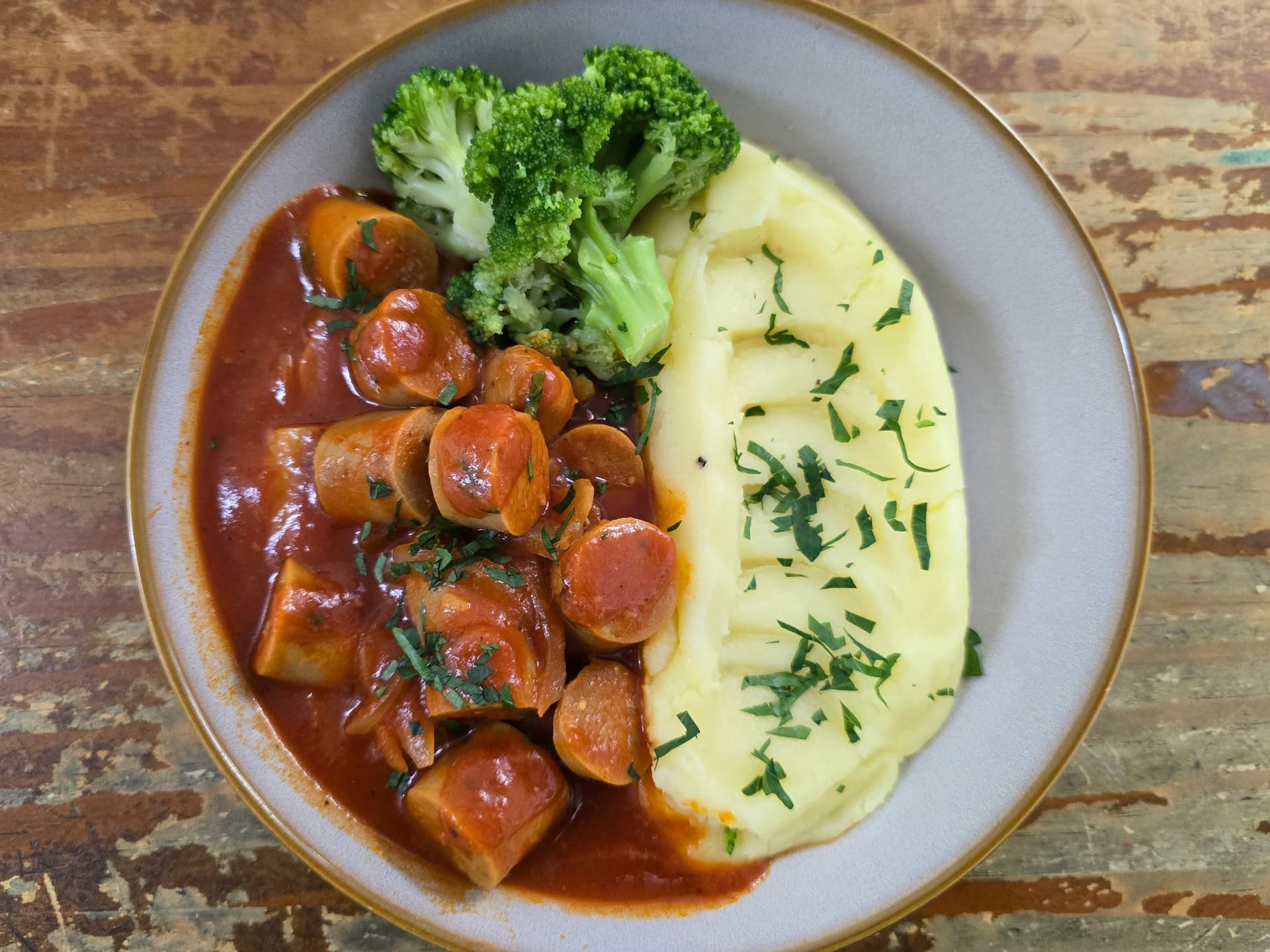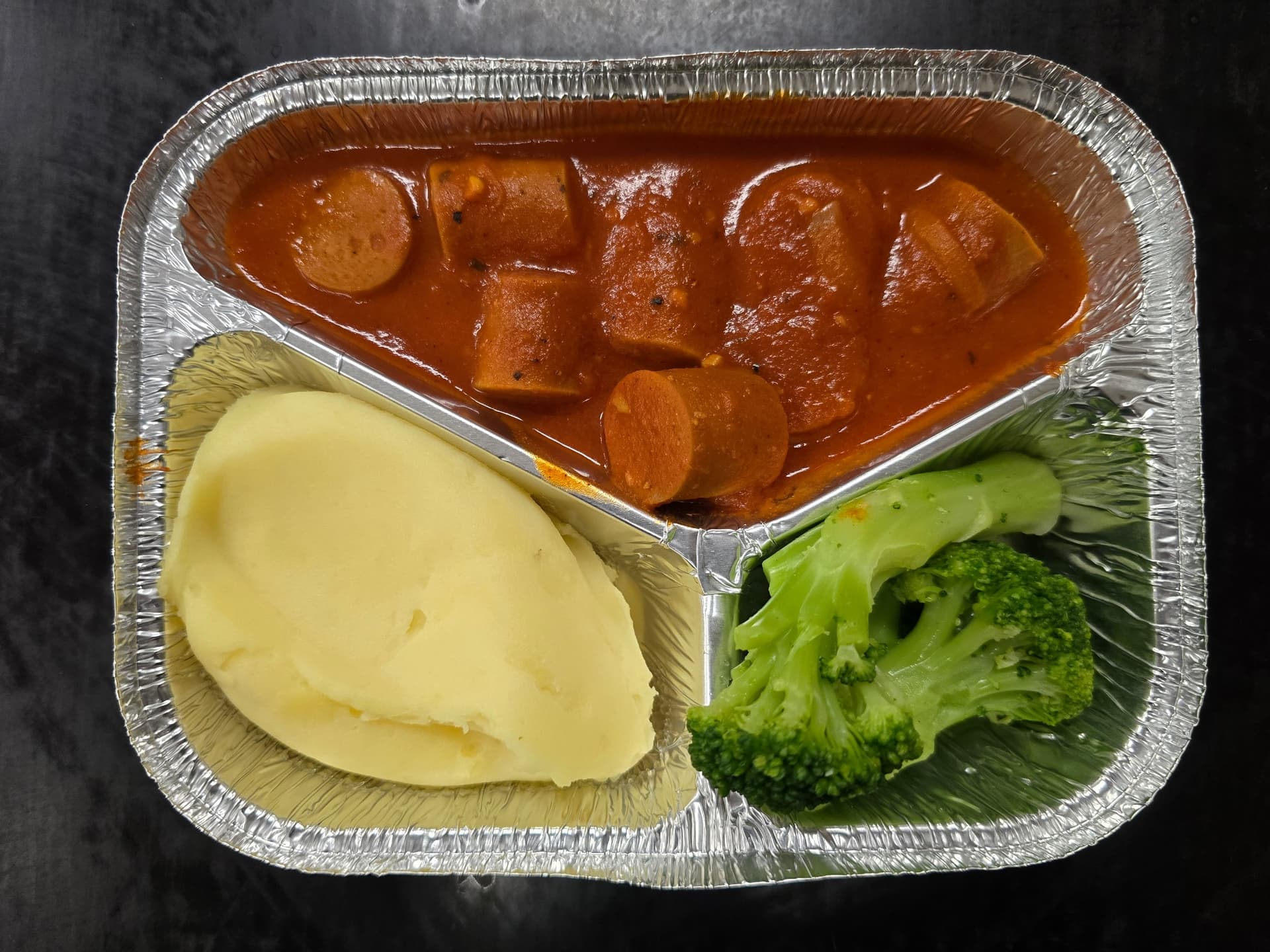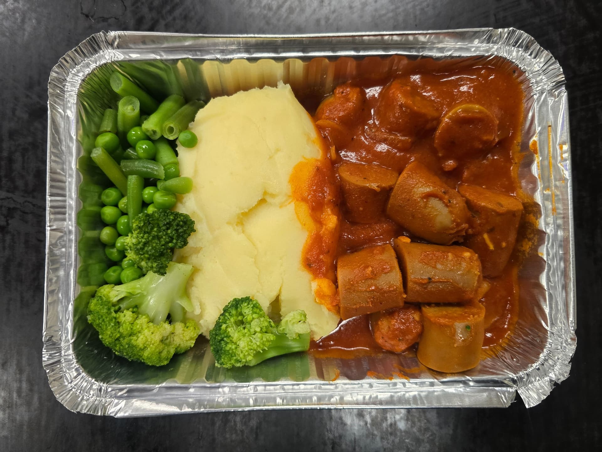 Curried Sausages served with mash potatoes, broccoli, green beans and peas.