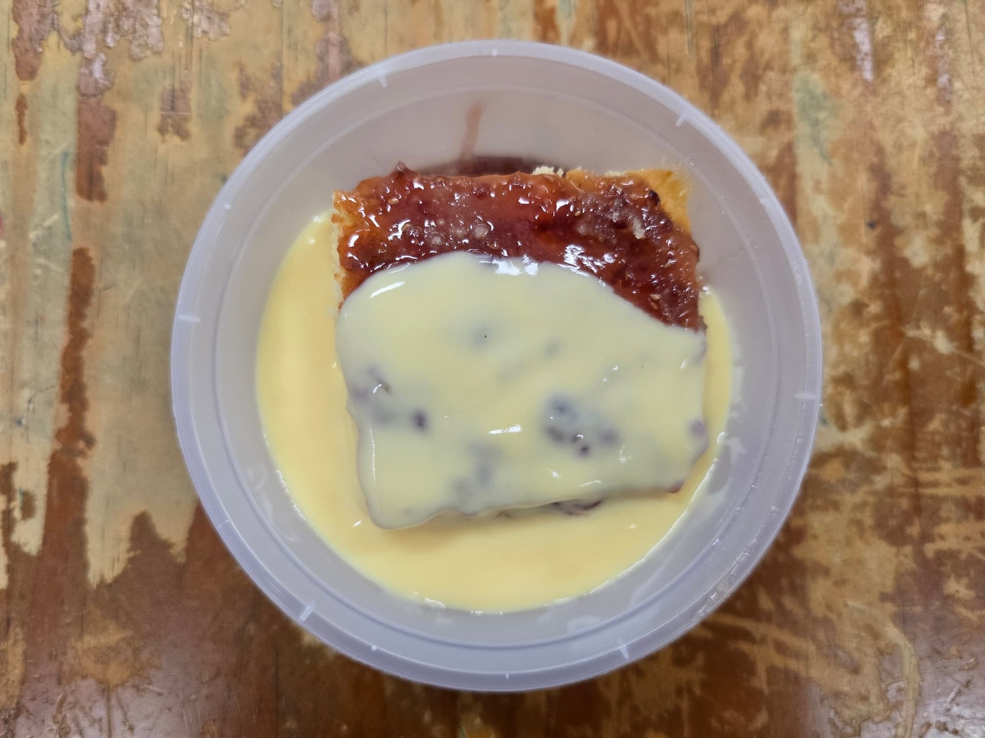 A comforting dessert consisting of a soft, sponge pudding infused with sweet jam flavours, served alongside creamy custard for a delightful combination of textures and tastes.