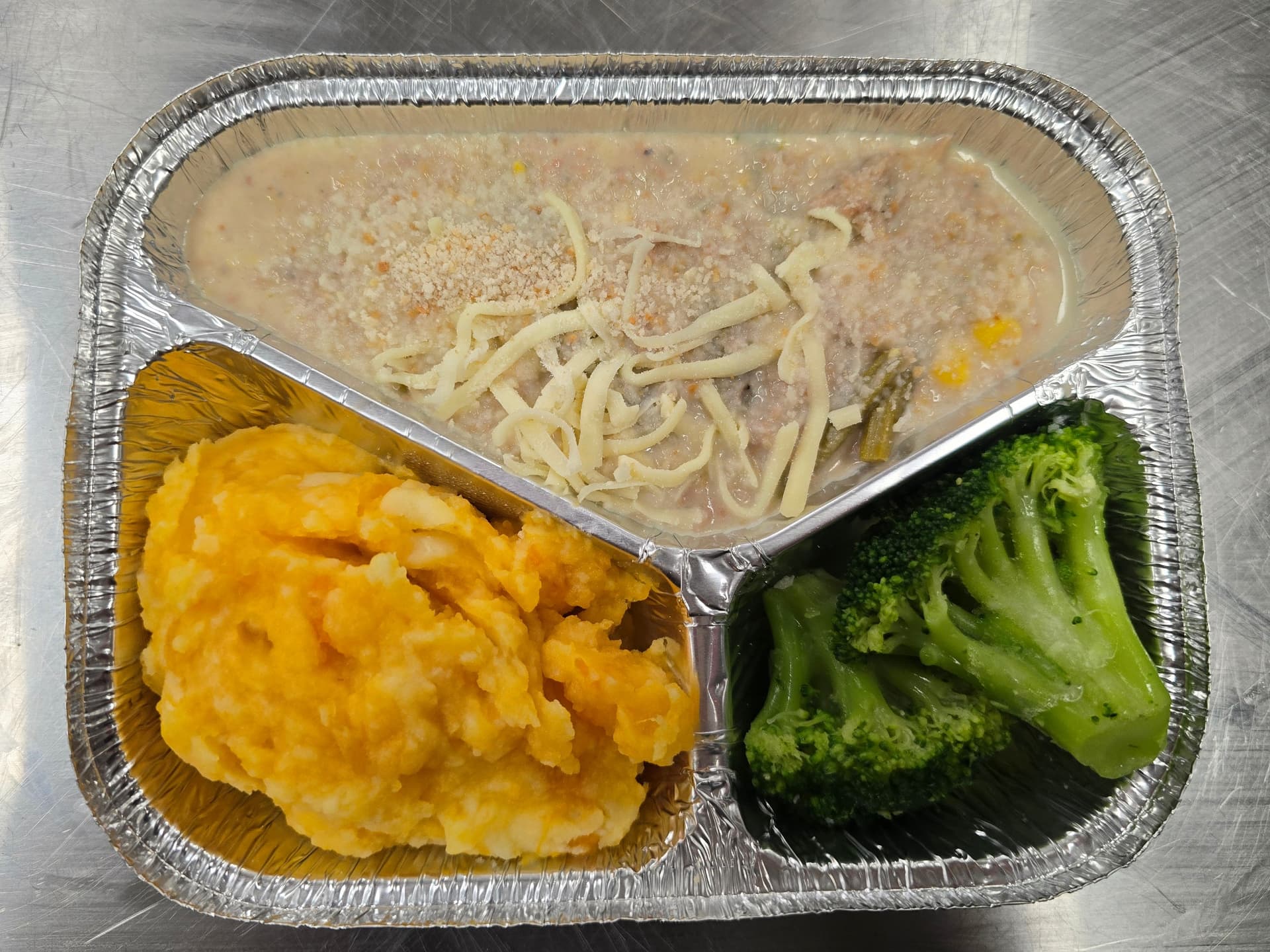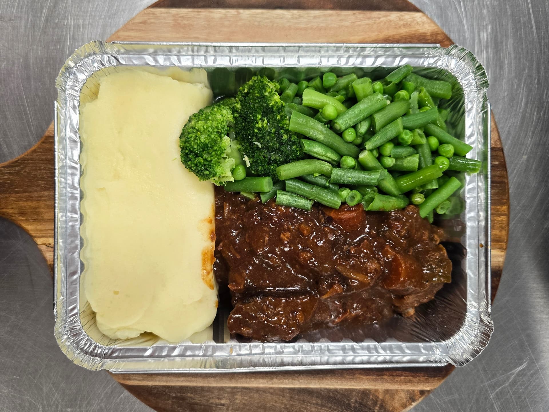 Classic French beef stew served with mash potatoes, broccoli, green beans and peas.