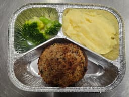 Rissoles in onion gravy served with mash potatoes, peas & carrots