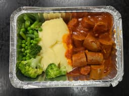Curried Sausages served with mash potatoes, broccoli, green beans and peas.