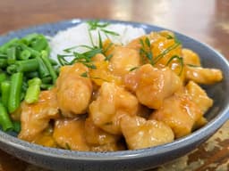 Apricot chicken served with rice and green beans