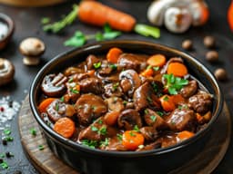 Classic French beef stew served with mash potatoes, broccoli, green beans and peas.