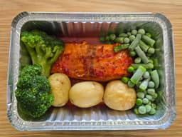 Salmon (Fish), Baby potatoes, Broccoli, Green beans, Peas, Sweet Chilli Sauce [Sugar, Water, Pickled red chilli, Distilled vinegar, Garlic, Salt, Stabiliser, Xanthan gum (E415)], Garlic Butter [Butter (Milk), Garlic, Italian herbs], Salt, Olive oil, Pepper, Lemon juice, Italian Herbs [Dried herbs & vegetables, Spices, Canola oil]