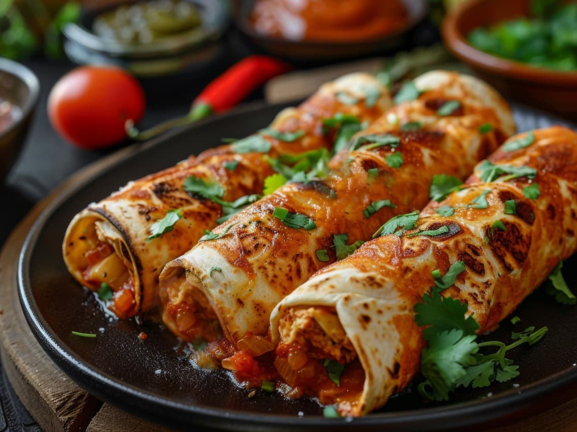 Mexican inspired chicken enchilada. This meal comes without any sides. It is a great option to share as a couple or split over a few meals with the addition of your preferred side from home.