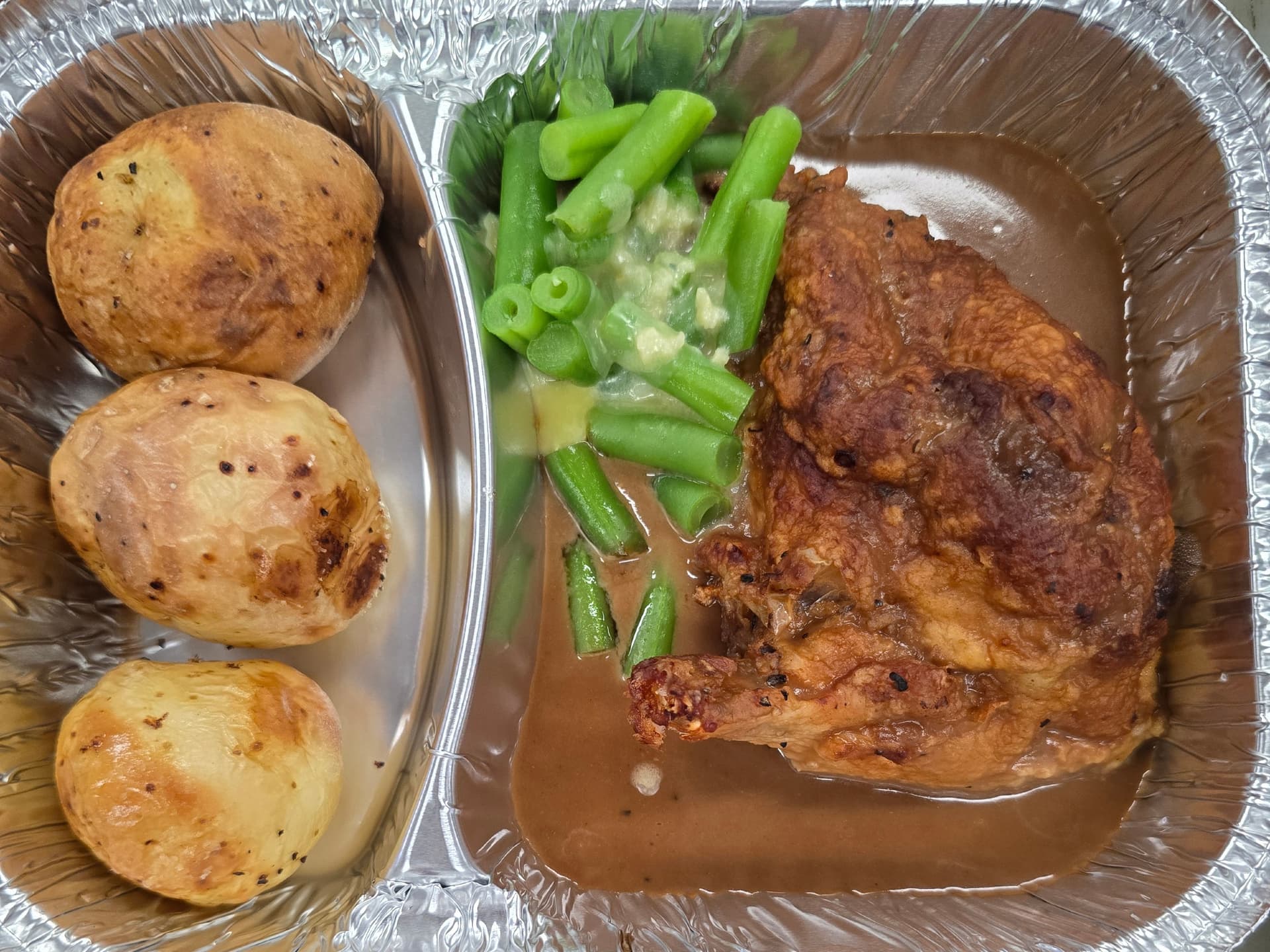 Roast Chicken served with baby boiled potatoes, green beans, peas & gravy.