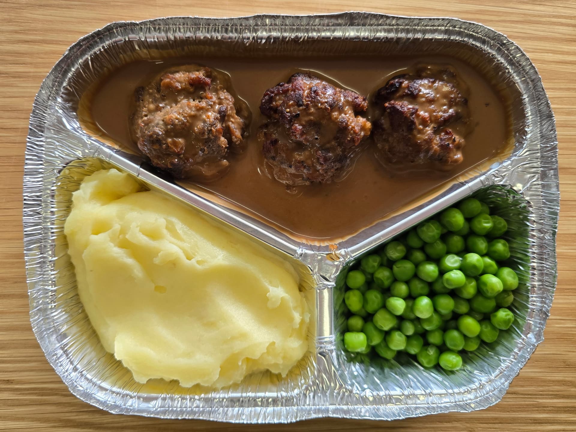 Tender Swedish Meatballs in a creamy gravy sauce. Served with mash potatoes and peas.