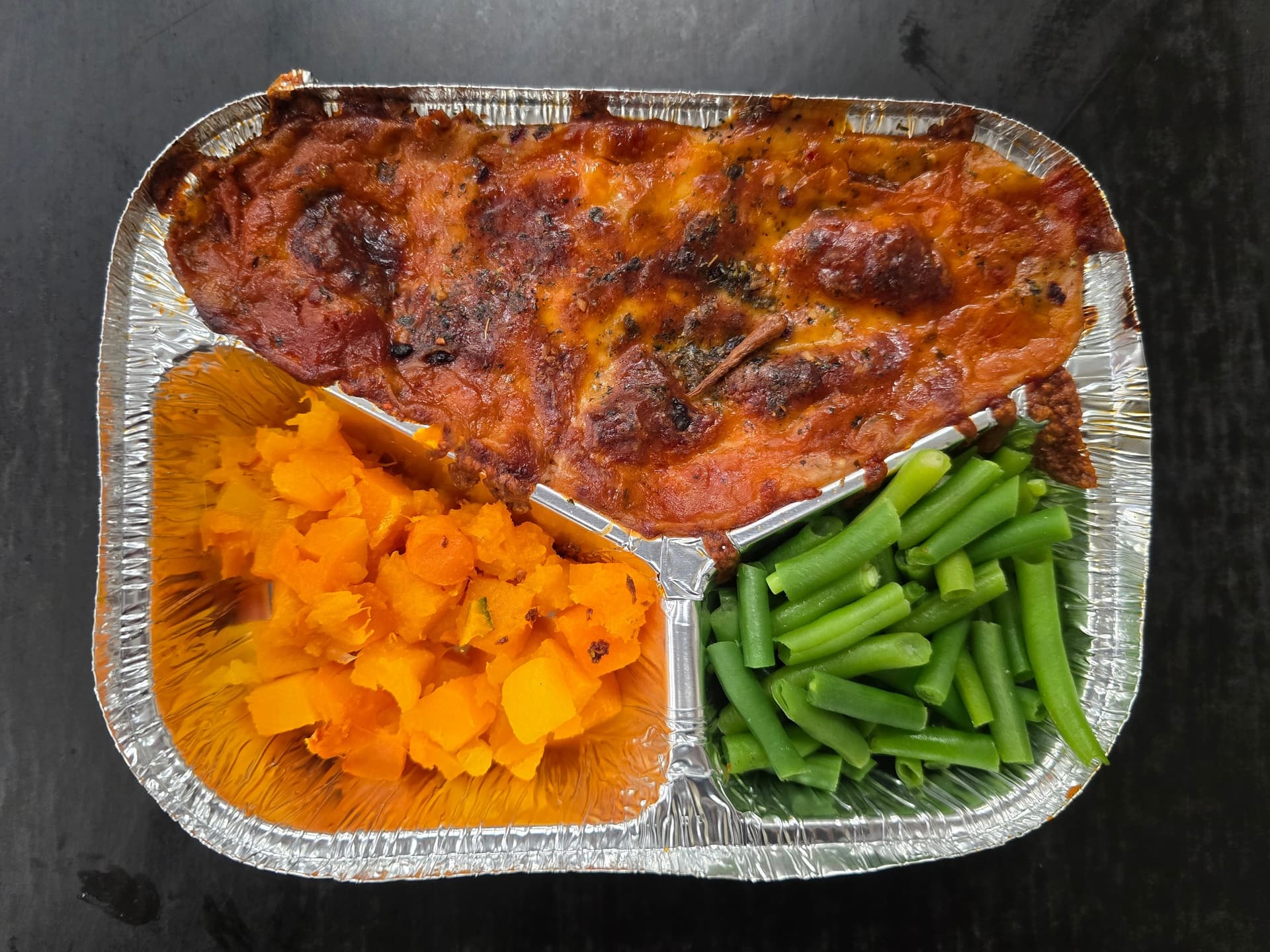 Vegetarian lasagne served with pumpkin cubes & green beans.