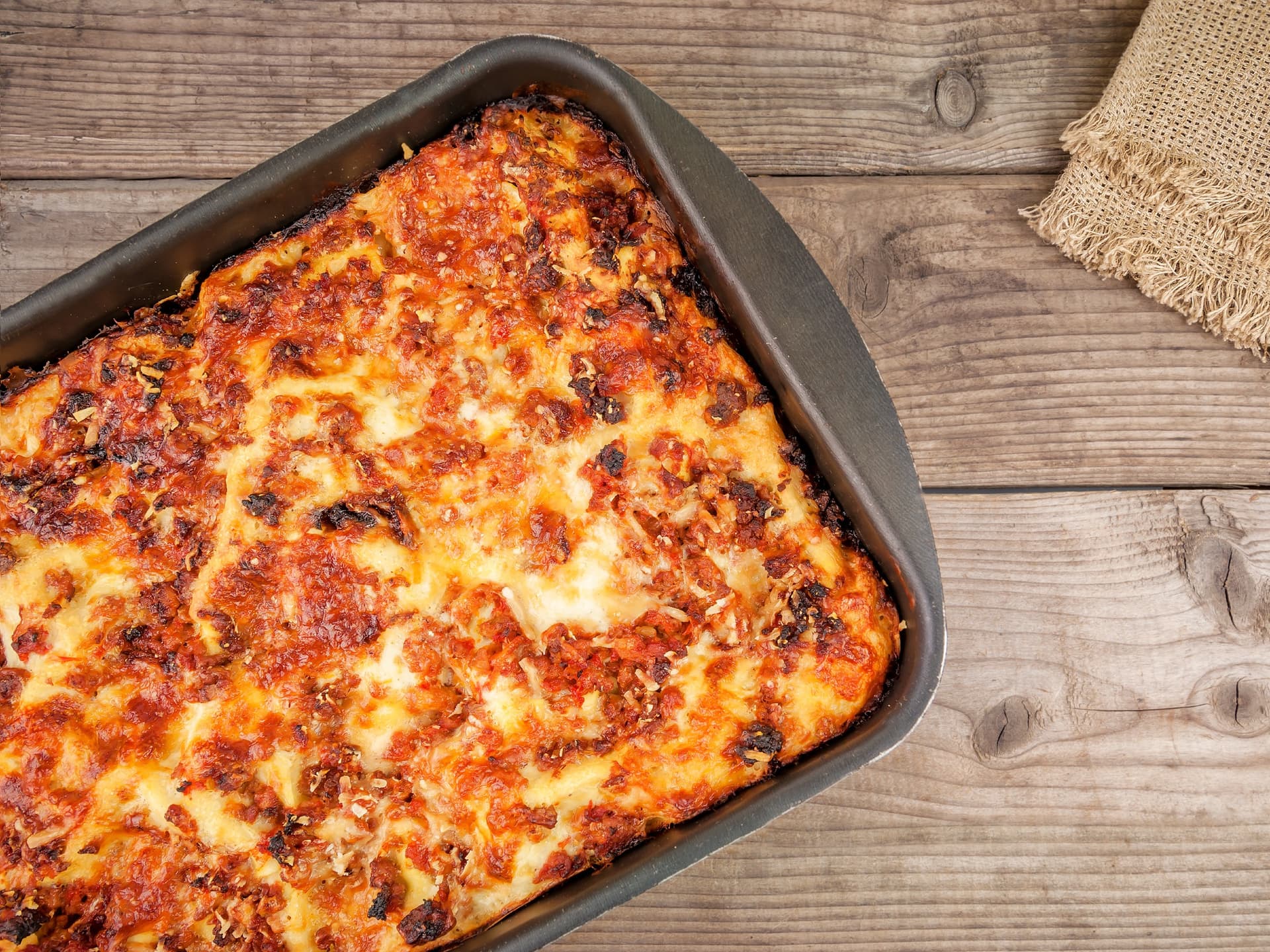 Family sized vegetarian lasagne that will serve four people a large serving size each or six people a standard size serving each.