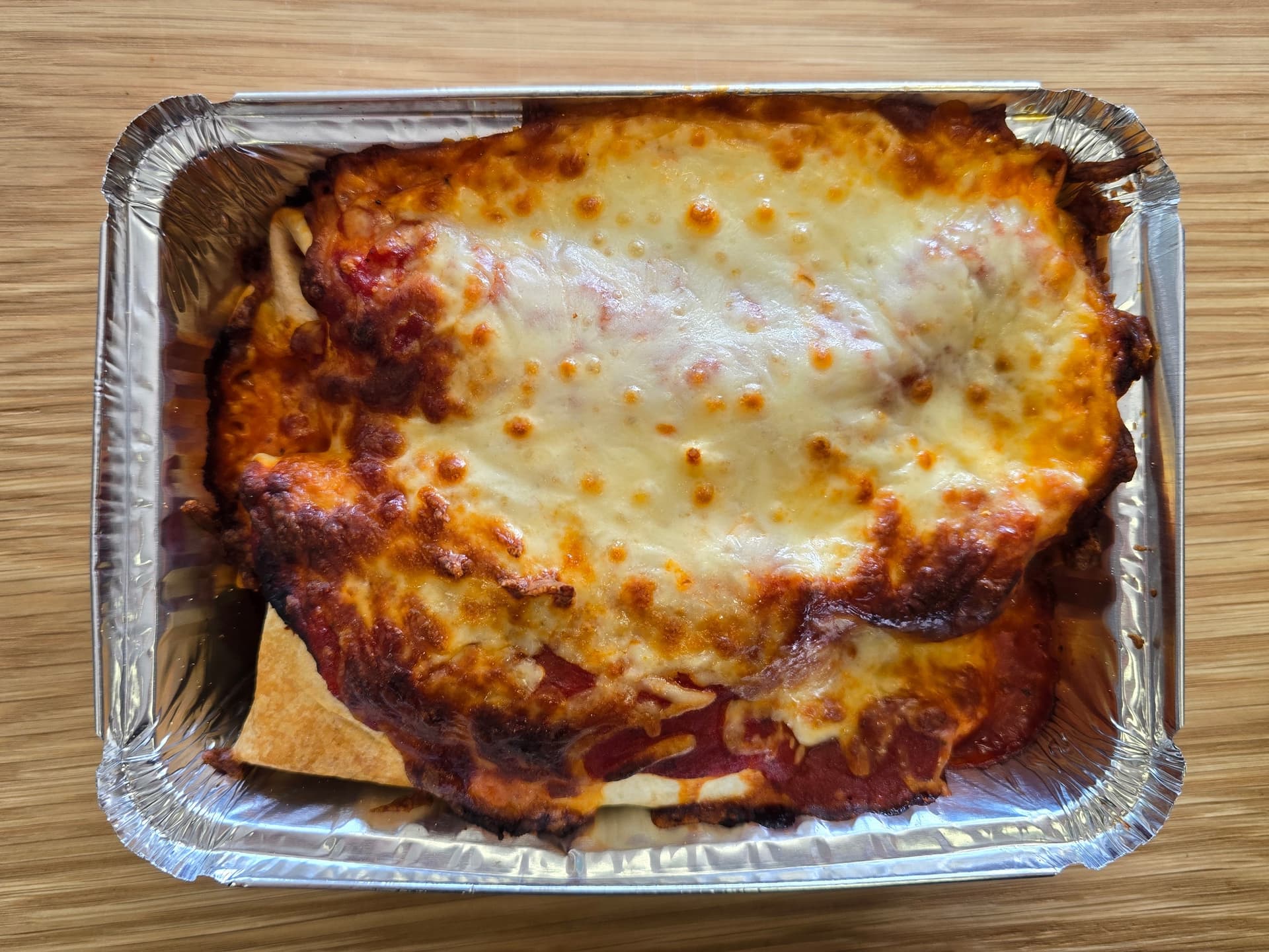 Family sized beef lasagne. This can serve four people a large serving size each or six people a standard size serving each.