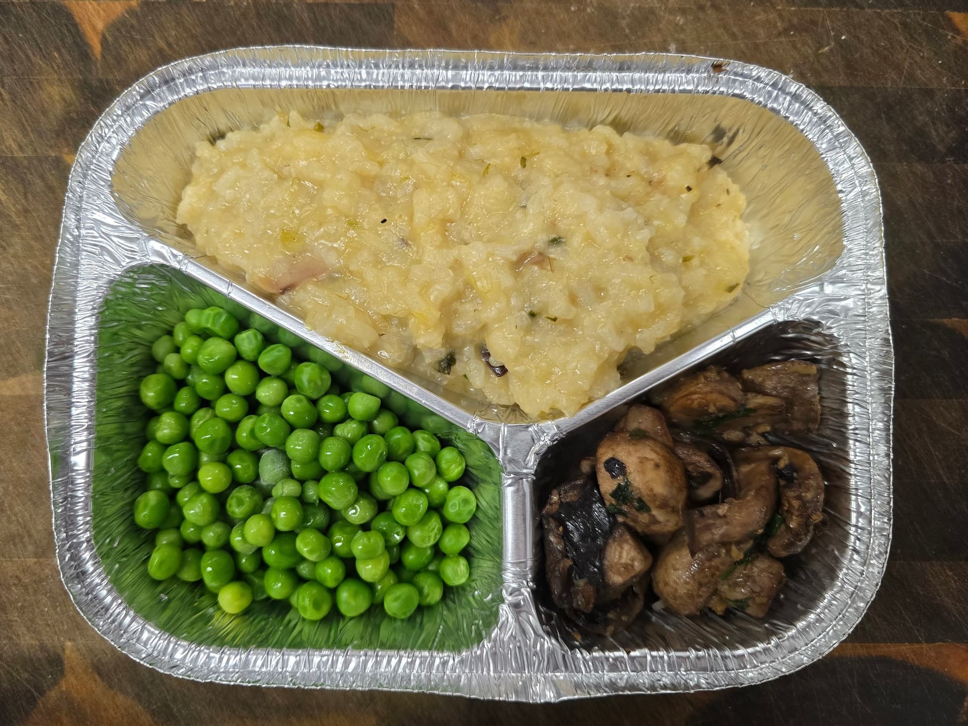 Leek and mushroom risotto served with peas & sautéed garlic mushrooms.