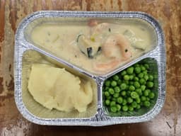 Garlic prawns in a creamy sauce served with mashed potatoes & peas.
