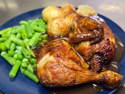 Roast Chicken served with baby boiled potatoes, green beans, peas & gravy.