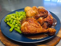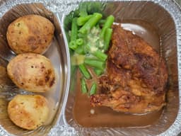 Roast Chicken with Bones [Mineral salt (451, 452, 450), Salt, Maltodexterin, Yeast extract, Vegetable powder, Onion, Garlic, Thickener (415), Acidity regulator (262), Herb extracts, Natural Colour (160c), Smoke flavour], Baby potatoes, Water, Green beans, Peas, Chicken Gravy [Rice flour, Maltodexterin, Modified Starch (1422), Iodised salt, Yeast extract, Chicken powder, Sugar, Beef fat, Flavour, Onion powder, Vegetable gum (412), Vegetable Gum (415), Colour (150c), Spices, Flavour enhancer (635), Herbs]