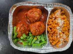 Italian meatballs (pork & beef) in rich ragu served with pasta and green beans