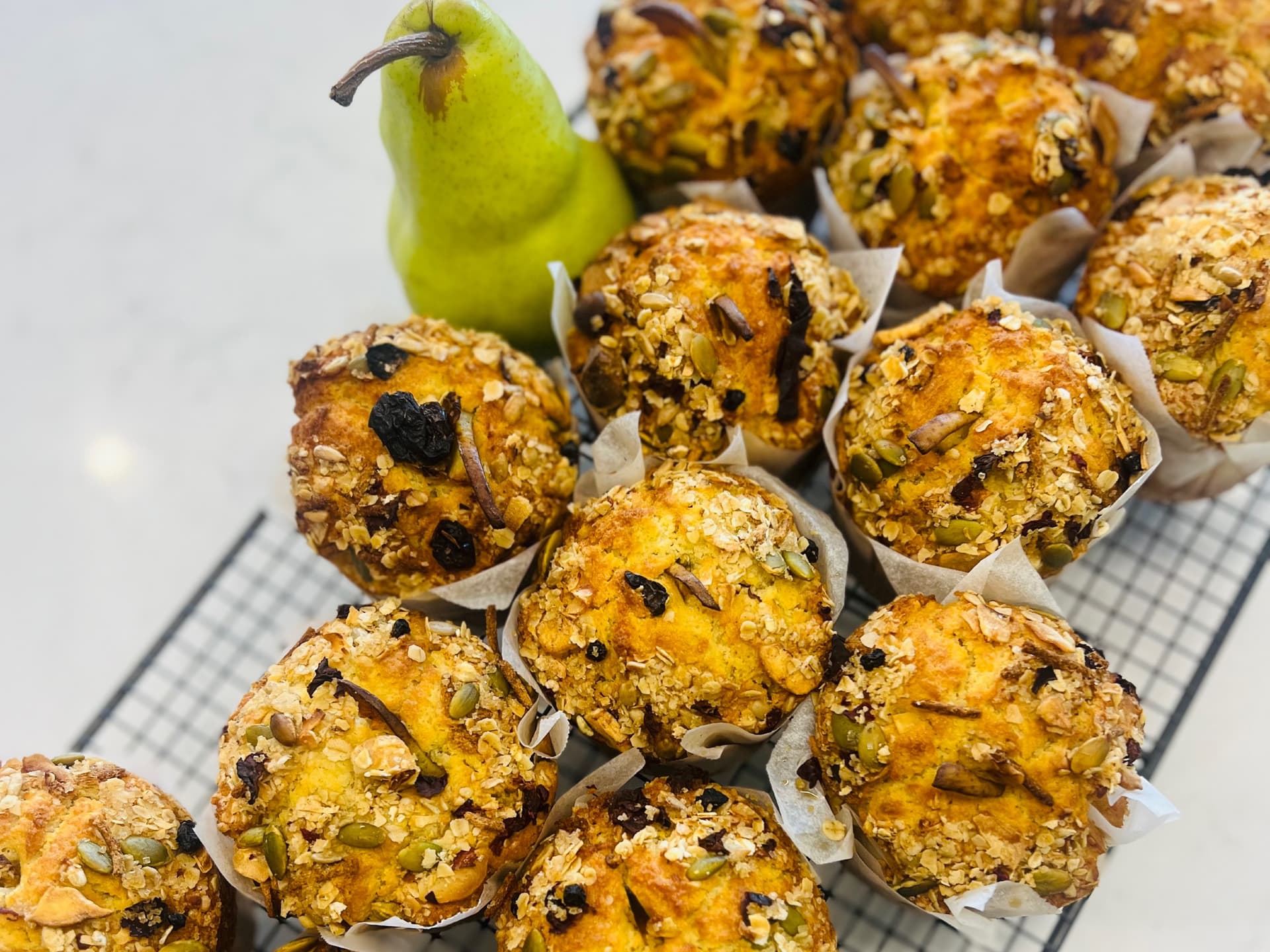 a box of our best selling pear and muesli muffins made in house-perfect for breakfast on the go or workplace morning/afternoon teas