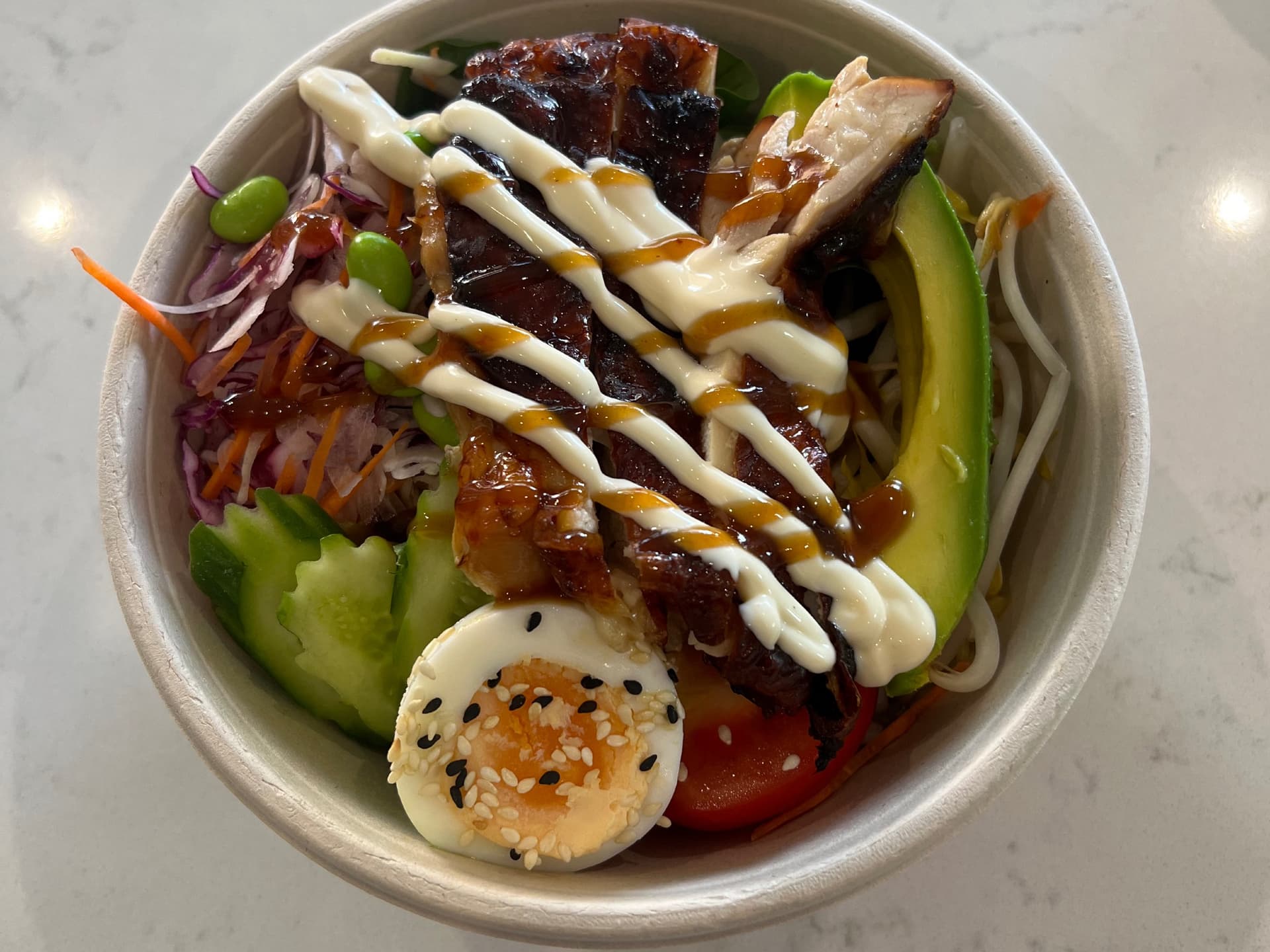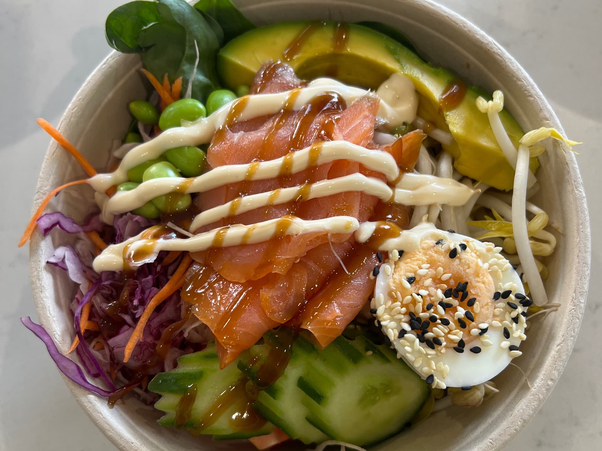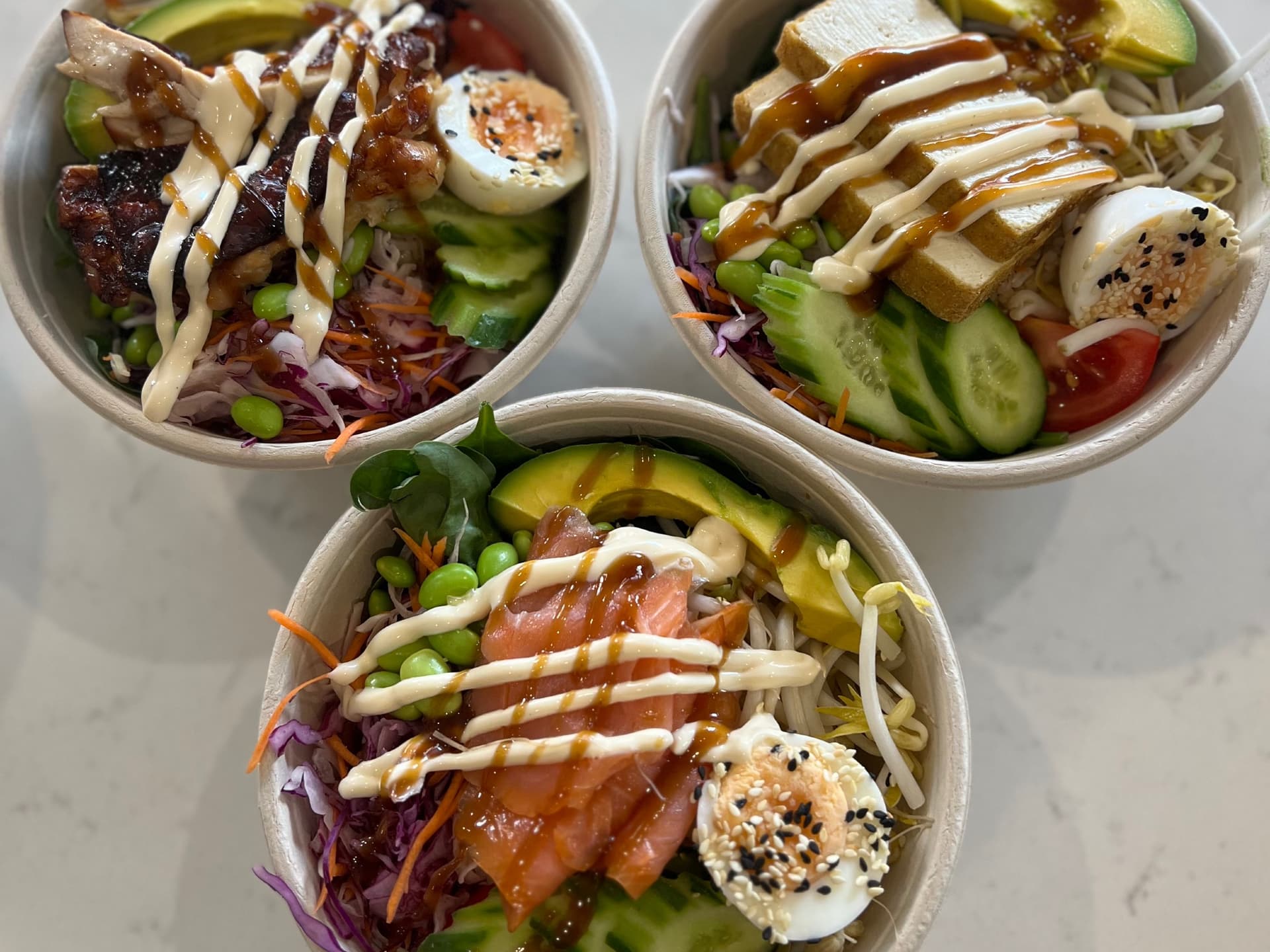 poke bowls are ideal for workplace catering or pre wedding lunch - with seasoned brown rice, your choice of protein, egg, soy mayo, edamame and fresh vegetables they are sure to fill even the hungriest tummy. Served in a 1000ml compostable Buddha bowl